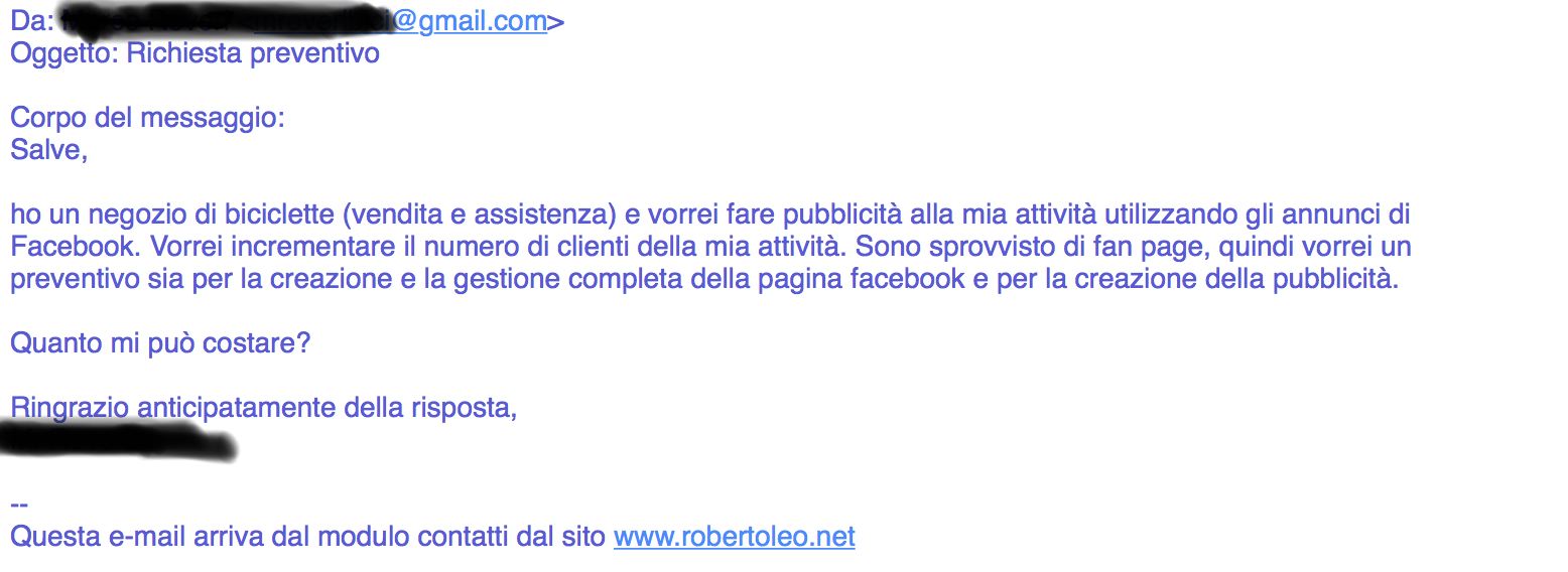 “” Buongiorno XXXXXXXXX, sono contento che ci ha contattato per avere informazioni riguardo la sua presenza su Facebook per espandere il suo business on-line. Ora non so se lei ci segue da un po’ e ha avuto modo di vedere qualche mio articolo sul mio blog in relazione a cosa è e come dovrebbe essere gestita la propria presenza on-line; capirà che fare un preventivo “ad occhi chiusi” significherebbe buttarle del fumo negli occhi!
